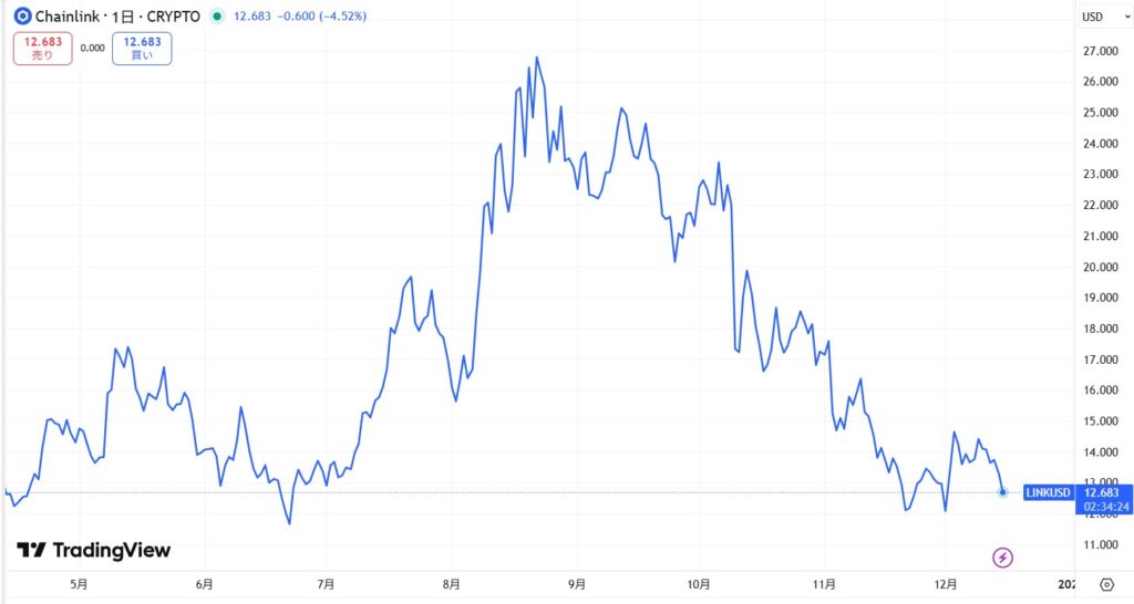 LINKは2021年5月以降から長期的な下落トレンドを形成していたが、本記事執筆時点(2025年12月)では反発傾向にある。