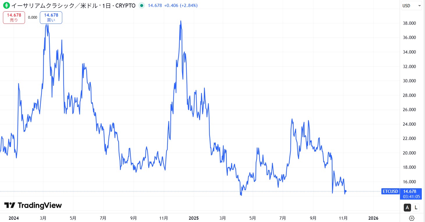 以下は、2024年11月~2025年11月までのETC/USDの価格動向を示したチャートだ。