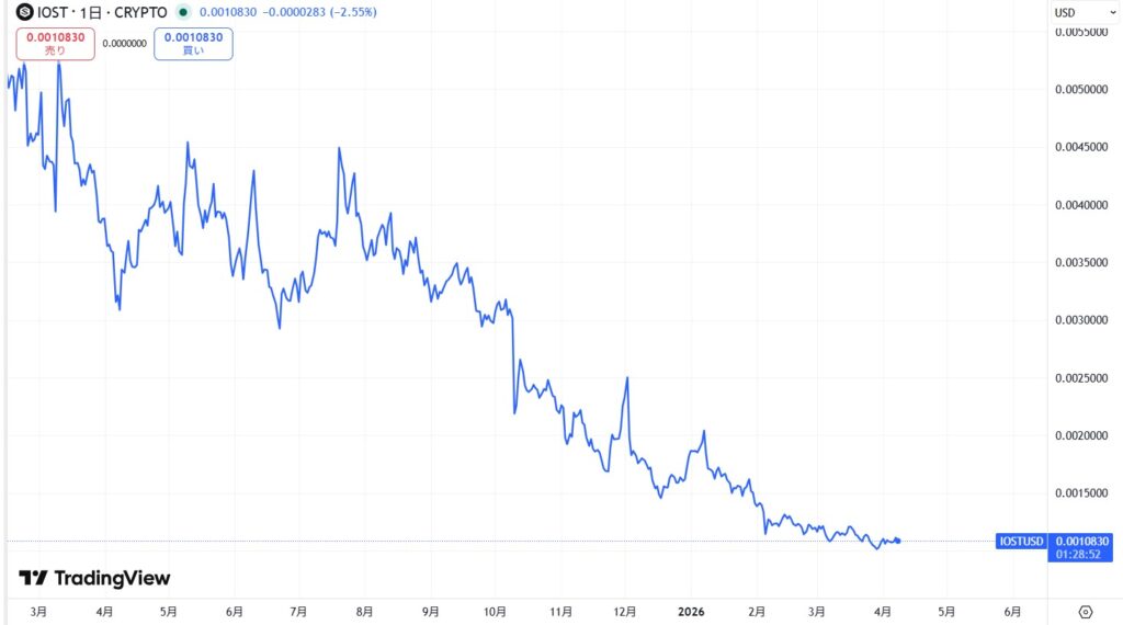 まずは、ローンチされた2018年1月から本記事更新時点(2026年4月)までの値動きを、IOST/USDチャートで追ってみよう。