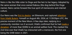 公式サイトによると、「Neiro is like the little sister to Doge and the heir to her legacy.」と書かれている。