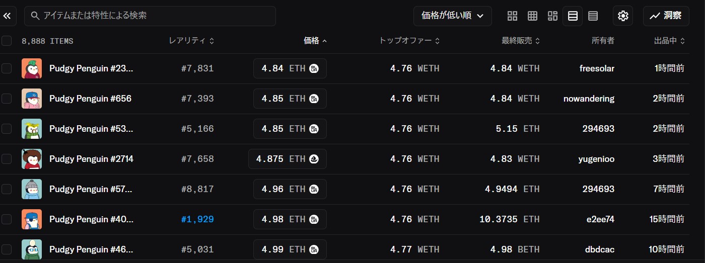 ここからはPudgy PenguinsのNFTの価格動向を見ていこう。