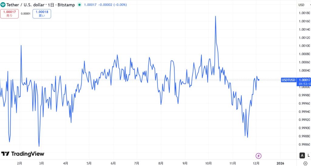 次に、RLUSDと同じく米ドル連動ステーブルコインであるUSDTとUSDCの値動きをチェックしておこう。