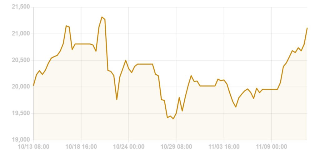 次に、本記事執筆時点(2025年11月)から直近1カ月の間の、短期的な価格動向も確認しておこう。