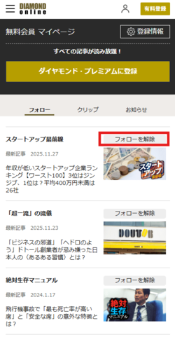 フォローの解除は、フォローボタンを再度クリック、もしくはマイページのフォローメニューから設定いただけます(ログインが必要です)。